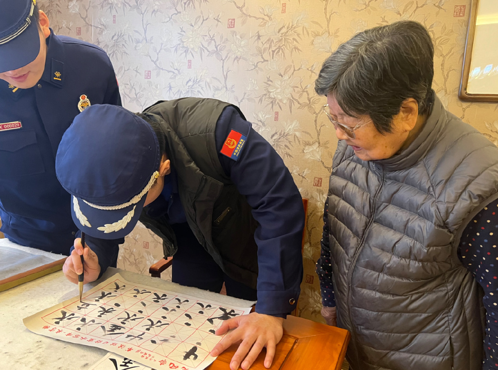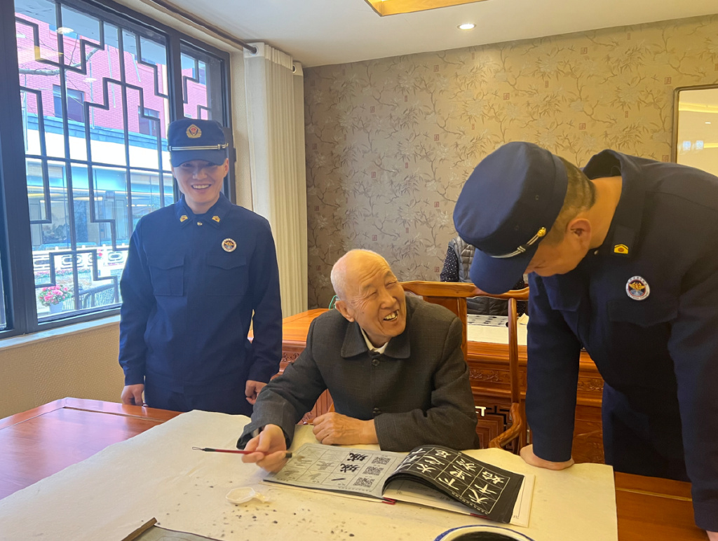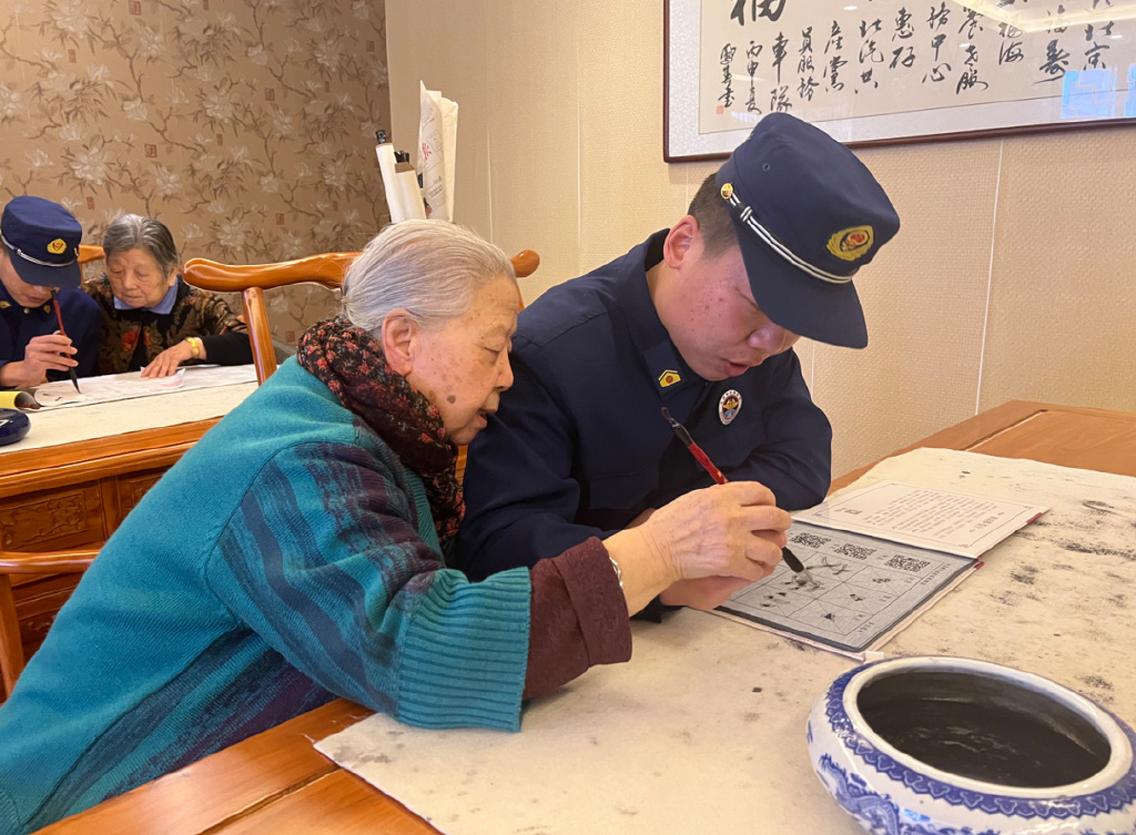 “来,小伙子我教你永字八法”“书法我们要从基础笔画开始练起”“这个字这样写漂亮多了”……书画室中,可爱的消防官兵们与慈祥的爷爷奶奶们欢声笑语不断,感谢每一位心怀大爱的消防官兵,用专业与爱守护着寸寸时光。