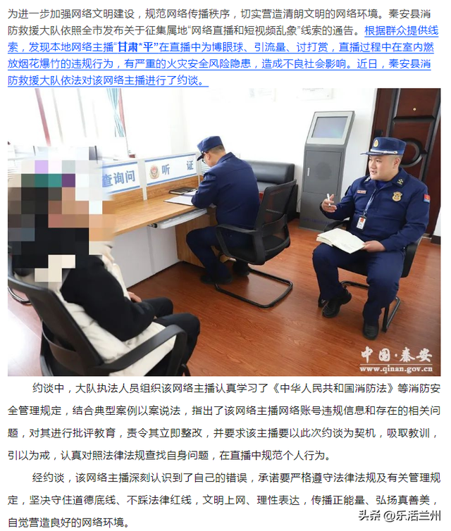根据群众提供线索,发现本地网络主播“甘肃*平”在直播中为博眼球、引流量、讨打赏,直播过程中在室内燃放烟花爆竹的违规行为,有严重的火灾安全风险隐患,造成不良社会影响。近日,秦安县消防救援大队依法对该网络主播进行了约谈。
