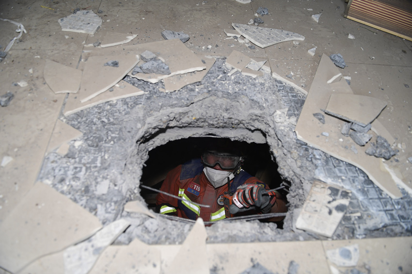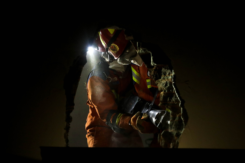 在综合破拆救援中消防员正在对墙体进行破拆。四川省消防救援总队供图