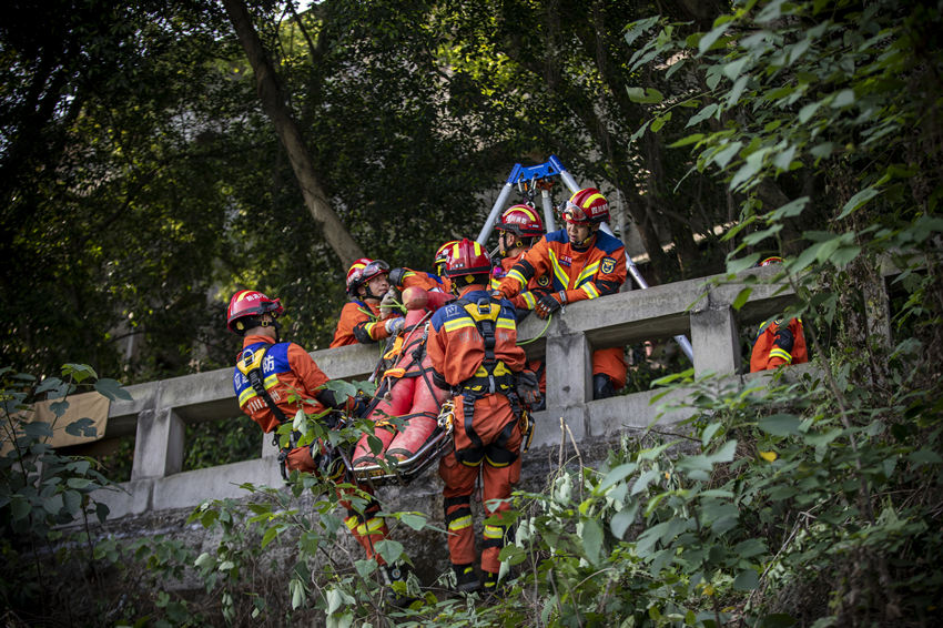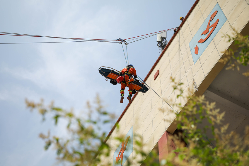 在高空负角度救援科目中消防员正在利用绳索、担架转移被困人员。四川省消防救援总队供图
