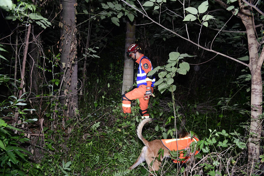 搜救犬训导员正在搜寻“被困群众”。四川省消防救援总队供图