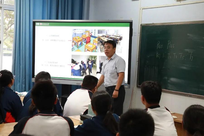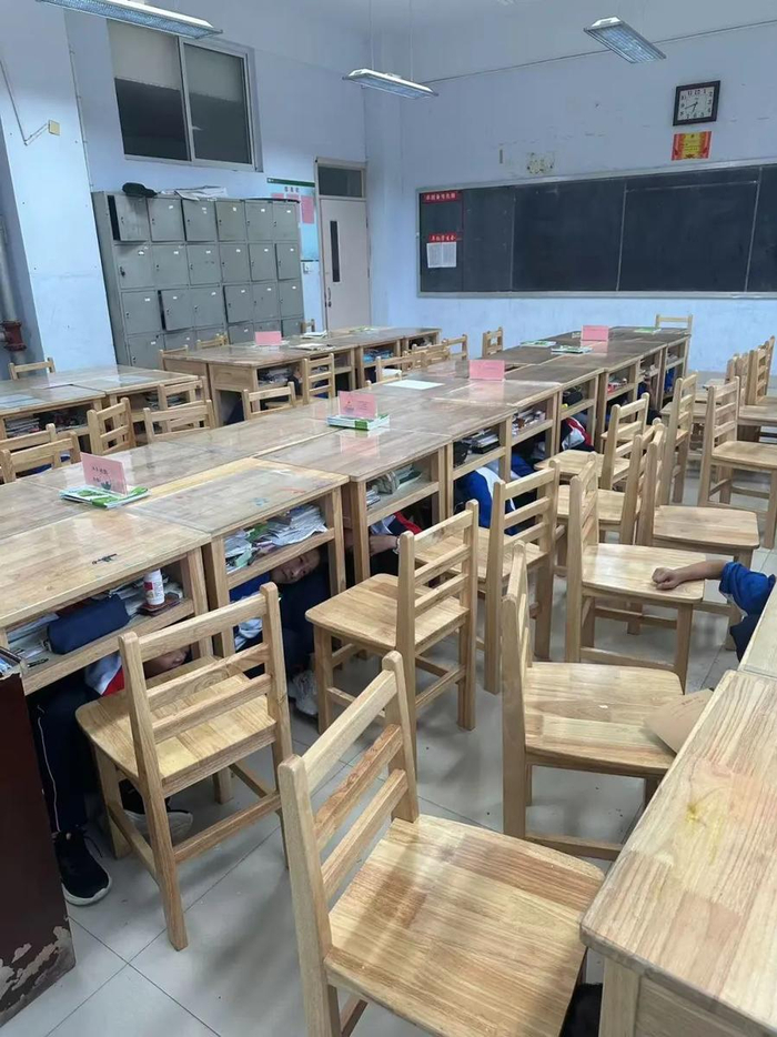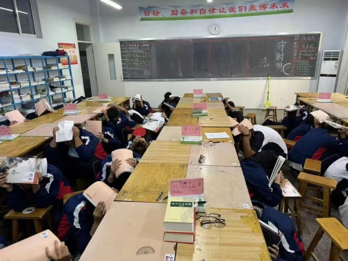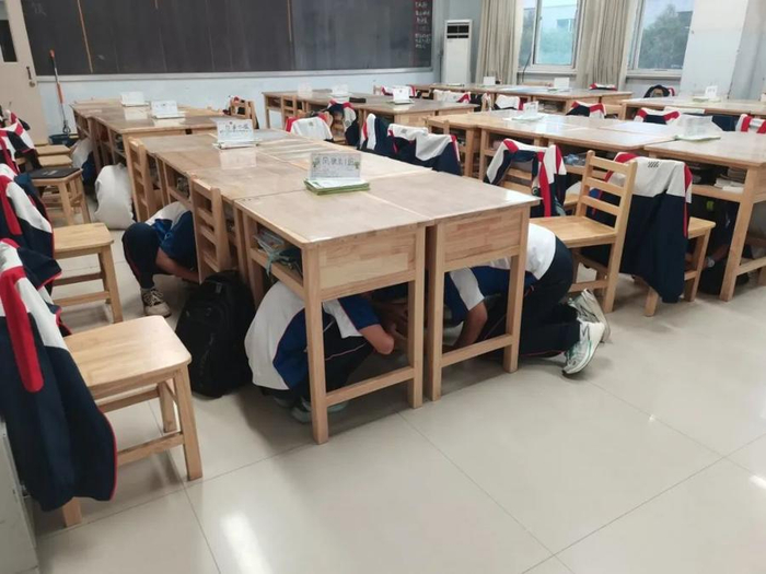 在防震演练时,同学们听到警报后,迅速做好避震准备,用双手护头,蹲在课桌下,就地避震。听到第二次警报后,学生在教师的指导下排队撤离,安全有序地集结到操场指定位置。
