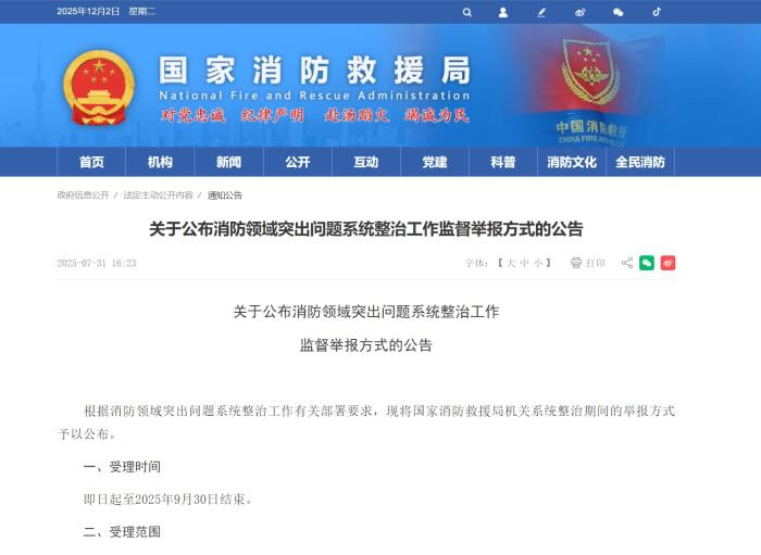 今年7月31日,国家消防救援局发布公告,向社会公布消防领域突出问题系统整治工作监督举报方式,受理消防监督执法、装备采购和工程建设、信息化建设、选人用人以及接受消防部门管理指导的科研院所、培训机构、社会组织、第三方服务机构等五个方面的违纪违法问题线索。