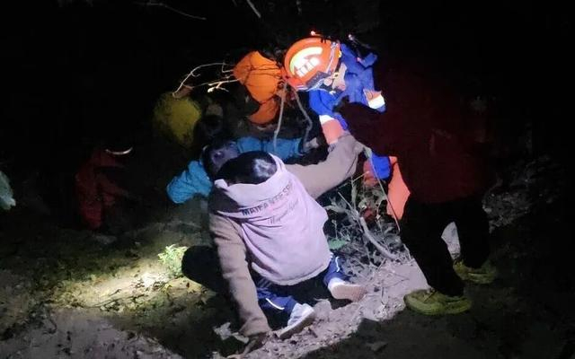 初冬的深山,夜晚气温骤降,能见度低,山路崎岖。救援人员一边艰难开路,一边不断通过呼喊、电话联络、闪烁灯光等方式试图确定被困者精确位置。