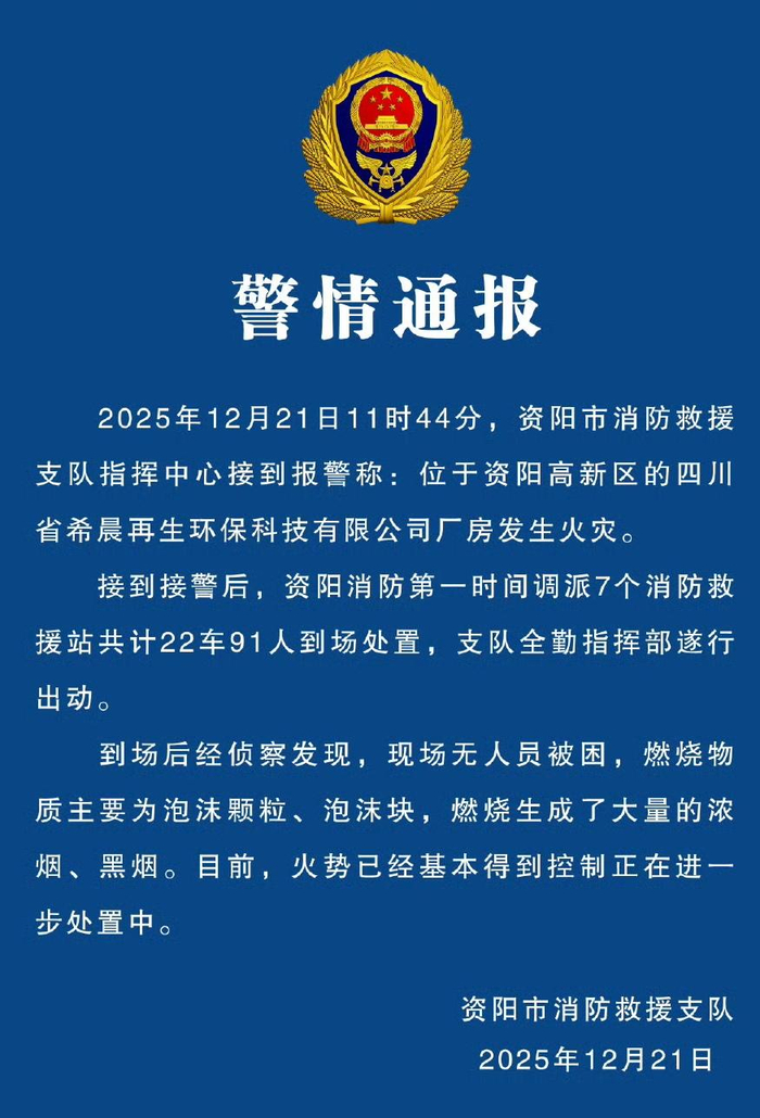 ▲警情通报通报介绍,当天11时44分,资阳市消防救援支队指挥中心接到报警称,位于资阳高新区的四川省希晨再生环保科技有限公司厂房发生火灾。接到接警后,资阳消防第一时间调派7个消防救援站共计22车91人到场处置,支队全勤指挥部遂行出动。到场后经侦察发现,现场无人员被困,燃烧物质主要为泡沫颗粒,泡沫块,燃烧生成了大量的浓烟,黑烟。目前,火势已经基本得到控制正在进一步处置中。