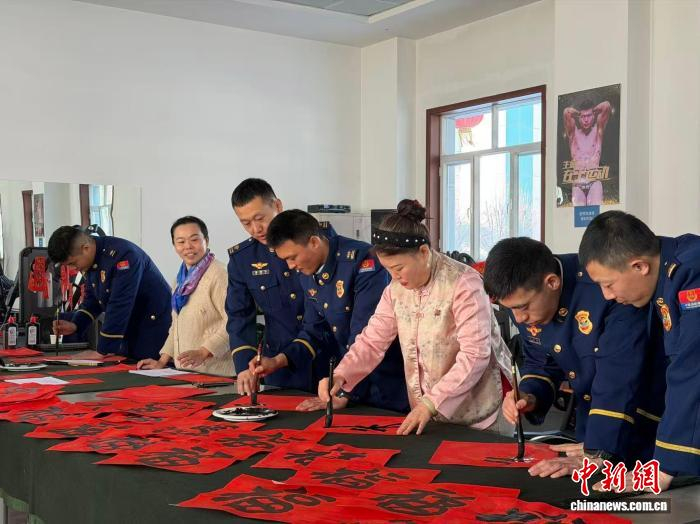 乌鲁木齐消防救援机动大队内,指战员与家属一同写春联。张家伟 摄乌鲁木齐消防救援机动大队大队长杜建茂说,在春节假期前的最后一个工作日进行装备和车辆的维护检修,以及冰面救援、绳索训练、搜救犬训练,目的是为了假期期间的战备执勤任务顺利完成,以保障市民过年期间财产和生命安全。(完)